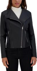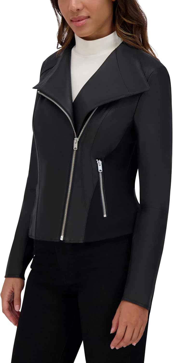 - Chic Design: Lightweight leather jacket features asymmetrical cut and rib knit paneling to combine elegence with a modern edge.